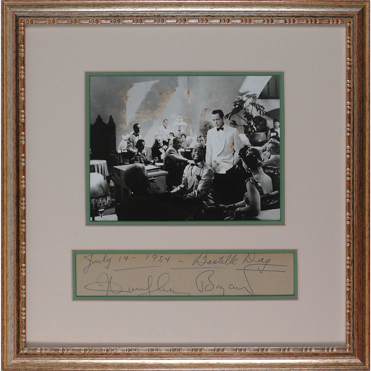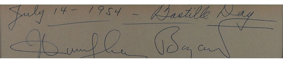 Vintage ballpoint signature, “Humphrey Bogart,” headed at the top in an unknown hand, “July 14—1954—Bastille Day,” on a light green 10 x 2 guest book page. Double-matted and framed to an overall size of 17.25 x 17.25. In fine condition, with the signature measuring an impressive 9.5? long.