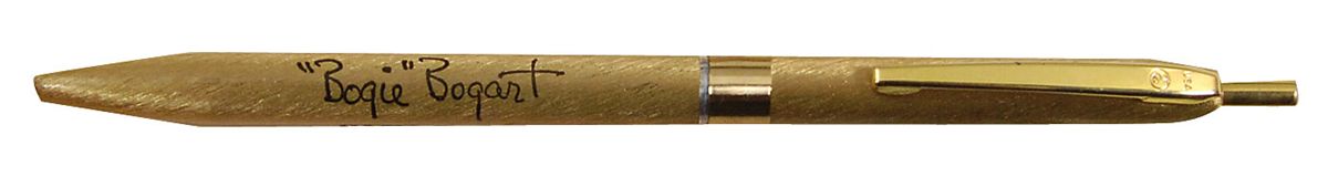 A gold ballpoint pen used by Bogart to sign an autograph for Al Wester, president of the US Golf Network, at the Beverly Hills Hotel in the 1950s. Pen has, “Thank You ‘Bogie’ Bogart,” printed on the side. Pen is accompanied by a 1998 handwritten letter from Wester which states, “Bogy gave me the pen when I ask him for an autograph. That was in the mid 50s at the Beverly Hills Hotel in California. I was there to broadcast a USC game.”