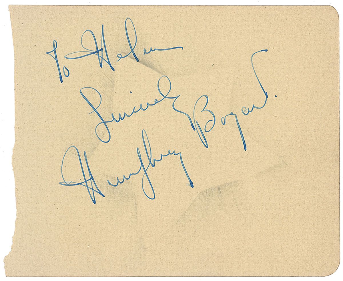 Vintage fountain pen signatures of ten cast members of Casablanca on individual album pages, sheets, and slips. Signers are: Humphrey Bogart (ins), Ingrid Bergman, Claude Rains (ins), Paul Henreid, Conrad Veidt, Sidney Greenstreet, Peter Lorre, Dooley Wilson, S. Z. Sakall, and Helmut Dantine. Other autographs included in the collection are vintage fountain pen signatures of Bogart's wives, “Mayo Methot Bogart,” “Lauren Bacall Bogart,” and "Helen Menken," on individual album pages; a vintage matte-finish 3.5 x 5.5 photo of Ingrid Bergman, signed in black ink, and a vintage ink signature; a vintage matte-finish 8 x 10 photo of Paul Henreid, signed and inscribed in fountain pen, and accompanied by the original Warner Bros. Studio envelope; four glossy and satin-finish 10 x 8 photos from Bogart films, each signed in felt tip by one of his co-stars, including: Julie Bishop, Ida Lupino, Mary Astor, and Mark Lawrence; and a glossy 8 x 10 photo signed by Elisha Cook. Also included is a Peruvian 50 cincuenta bank note, signed vertically in blue ink by Casablanca screenwriter Julius J. Epstein; and an uncommon ballpoint signature from fellow Casablanca screenwriter, “Here’s looking at you kid, Howard Koch,” on an off-white slip.