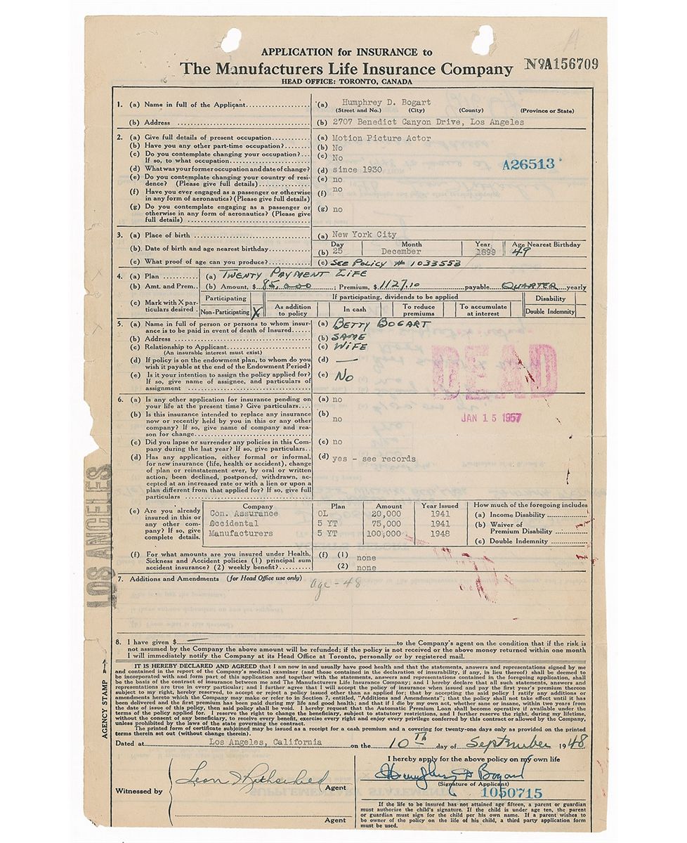 DS, signed “Humphrey D. Bogart,” one page both sides, 9 x 13.75, September 10, 1948. Application for an insurance policy from the Manufacturer’s Life Insurance Company. Policy is for $85,000, listing his wife Betty as his only beneficiary. Application also lists three other policies for Bogart totalling $195,000. Reverse bears a report written by the insurance agent listing Bogart’s personal information, and goes on to state he is in good overall health, lists his monthly income at $100,000 from “salary and profits,” and recommending his policy at ordinary rates, “subject to rating.” At the bottom the agent requests, “Please date policy 24 June, 1948 to issue at age 48.” Signed at the bottom of the front by Bogart. Front of the document also bears a large red stamp which states, “DEAD Jan 15, 1957.” In very good condition, with expected document wear, some paper loss and small tears to edges, and some scattered light soiling. Bogart would succumb to esophageal cancer on January 14, 1957, after fighting the disease valiantly for several years.