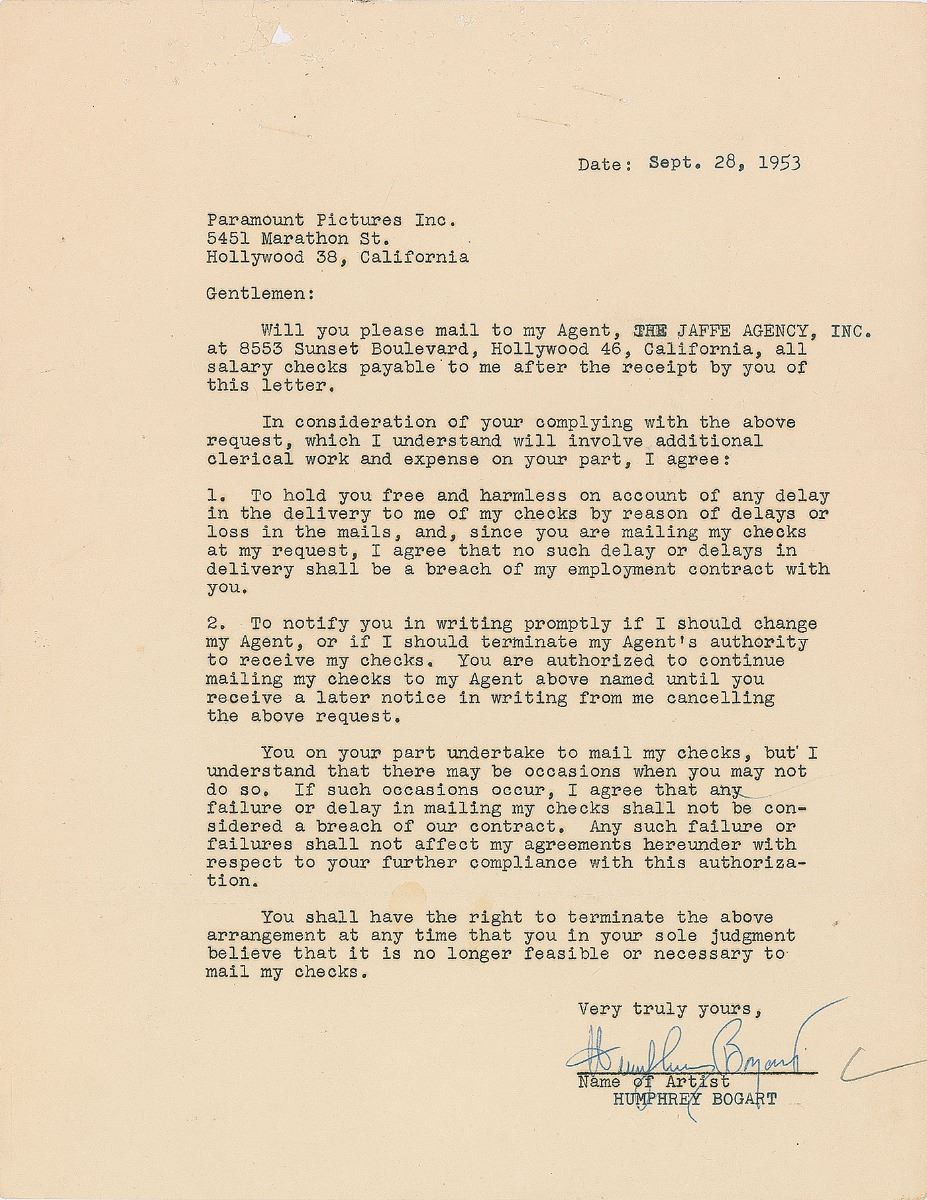 TLS, one page, 8.5 x 11, September 28, 1953. Letter to Paramount Pictures, Inc., in part: “Will you please mail to my Agent, The Jaffe Agency, Inc. at 8553 Sunset Boulevard, Hollywood 46, California, all salary checks payable to me after the receipt by you of this letter…You on your part undertake to mail my checks, but I understand that there may be occasions when you may not do so. If such occasions occur, I agree that any failure or delay in mailing my checks shall not be considered a breach of our contract. Any such failure or failures shall not affect my agreements hereunder with respect to your further compliance with this authorization.” In fine condition, with a short tear and a plethora of staple holes to the top margin.
