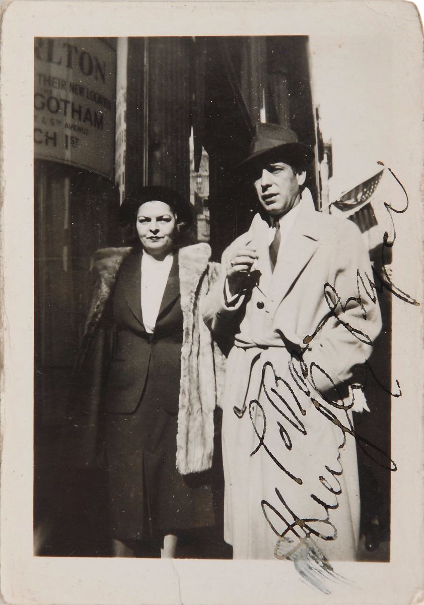 Vintage glossy 2.5 x 3.5 candid photo of Bogart wearing a long coat and standing next to wife/actress Mayo Methot, signed and inscribed in black ink, “To Rose, Humphrey Bogart.” Reverse bears a collector’s date notation, “Taken Feb. 13, 1939, On Fifth Ave. N. Y. C.” In fine condition, with a brush to the “H” in his first name.