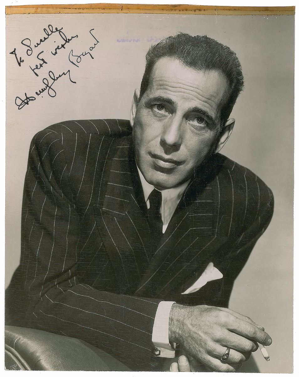 Vintage glossy 7.25 x 9.25 Warner Brothers publicity portrait of Bogart wearing a dark pinstripe suit and holding a cigarette, signed and inscribed in fountain pen, “To Lucille, Best wishes, Humphrey Bogart.” Reverse bears a Warner Bros. and a Henry Waxman photography stamp. In very good condition, with old cellophane tape to top edge (well away from image and signature and easily matted out), show-through from purple ink stamp lightly touching his hair, and scattered light overall creasing and crazing to the emulsion; the writing is dark and contrasts well against the empty background. A striking image of the Hollywood legend.