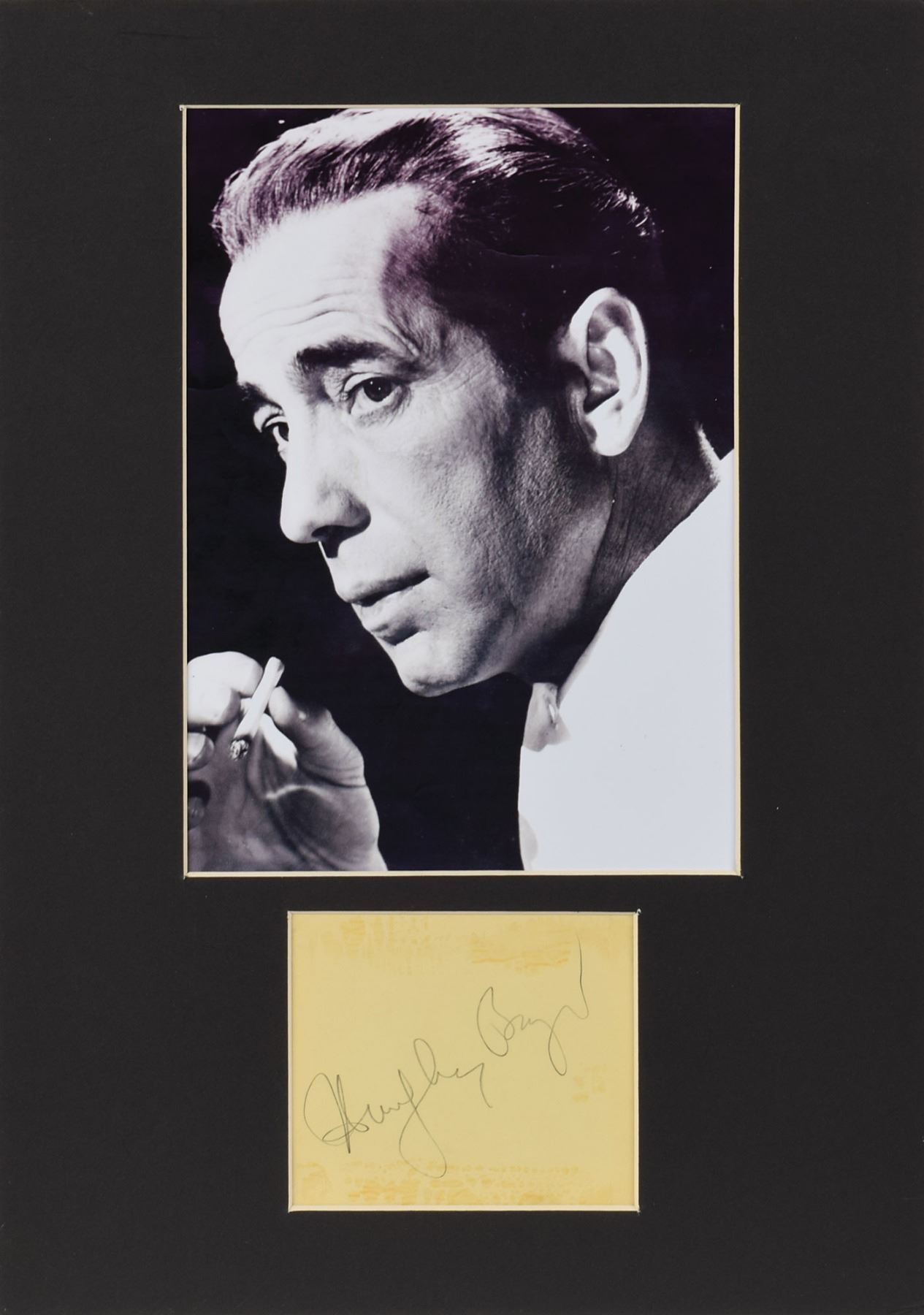 Vintage pencil signature, "Humphrey Bogart,” on a yellow 4.25 x 3.75 sheet. Matted with a photo of Bogie to an overall size of 11.75 x 16.5. In very good to fine condition, with adhesive residue above and below the signature.
