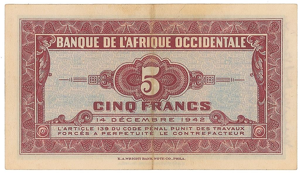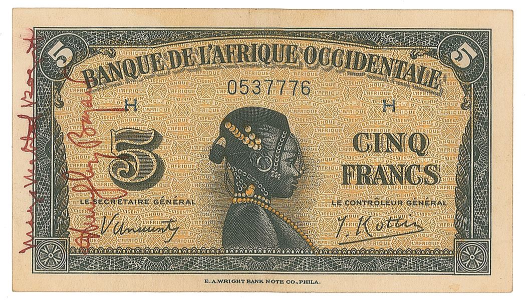 Banque d'Afrique Occidentale (Bank of West Africa) currency note for five francs, 4.5 x 2.5, dated December 14, 1942, signed vertically along the left side in red ink, "Humphrey Bogart" and "Mayo Methot Bogart." In fine condition, with an unobtrusive central vertical fold.