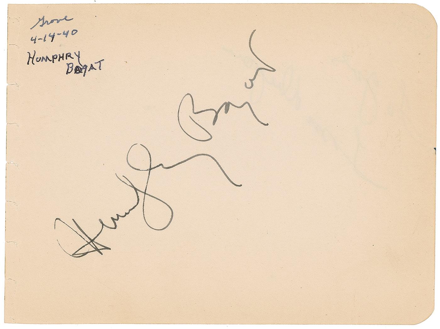Vintage fountain pen signature, “Humphrey Bogart,” on a 6 x 4.25 album page. In fine condition, with collector’s notation at upper left corner and faint show-through from signature on reverse. Pre-certified PSA/DNA and RRAuction COA.