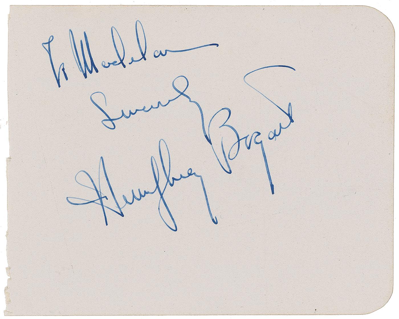 Vintage fountain pen signature and inscription, “To Madelan, Sincerely Humphrey Bogart,” on an off-white 5 x 4.5 slip. Accompanied by an unsigned glossy photo. In very fine condition. Pre-certified PSA/DNA and RRAuction COA.