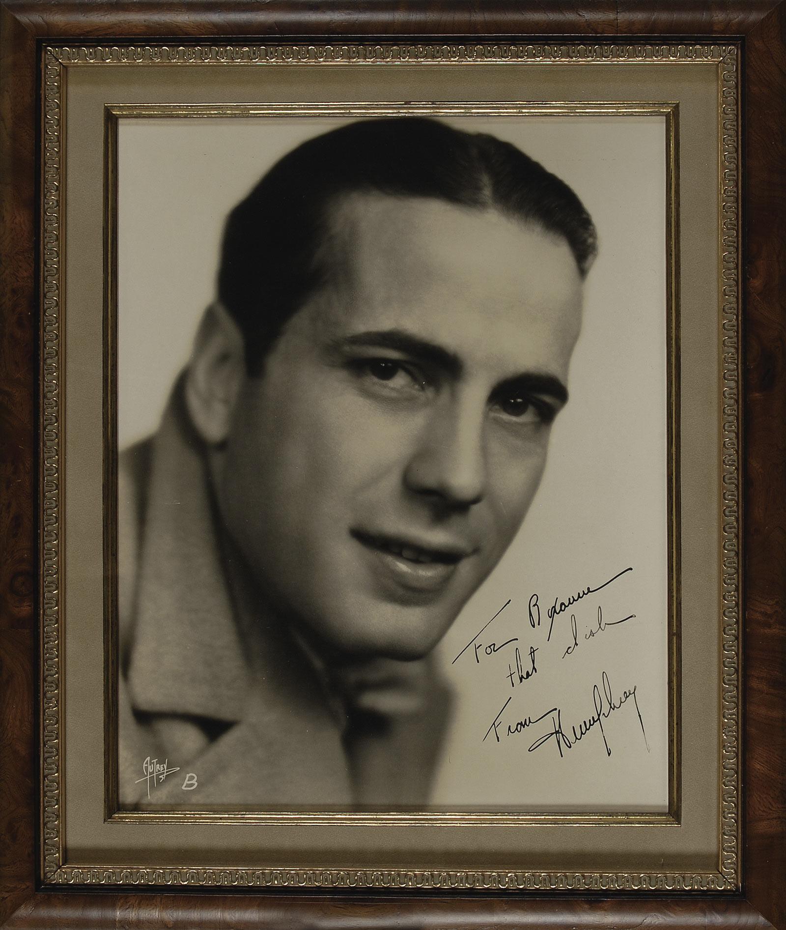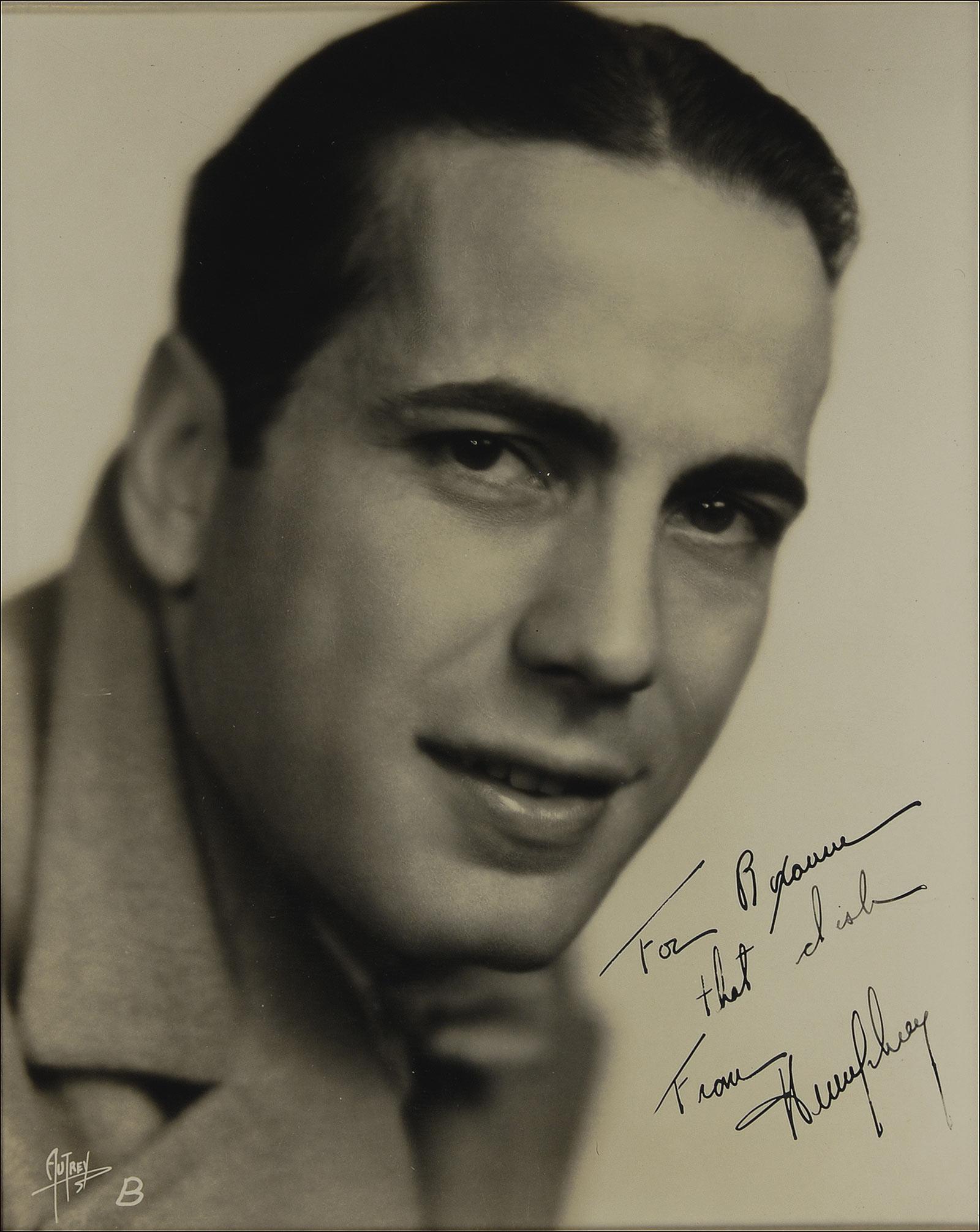 Extremely early vintage glossy 8 x 10 head-and-shoulders Autrey photo of the handsome and young Bogart, signed and inscribed in fountain pen “For Roxanne, that dish, from Humphrey.” In fine condition. Simply matted and framed to an overall size of 10.5 x 12.5.