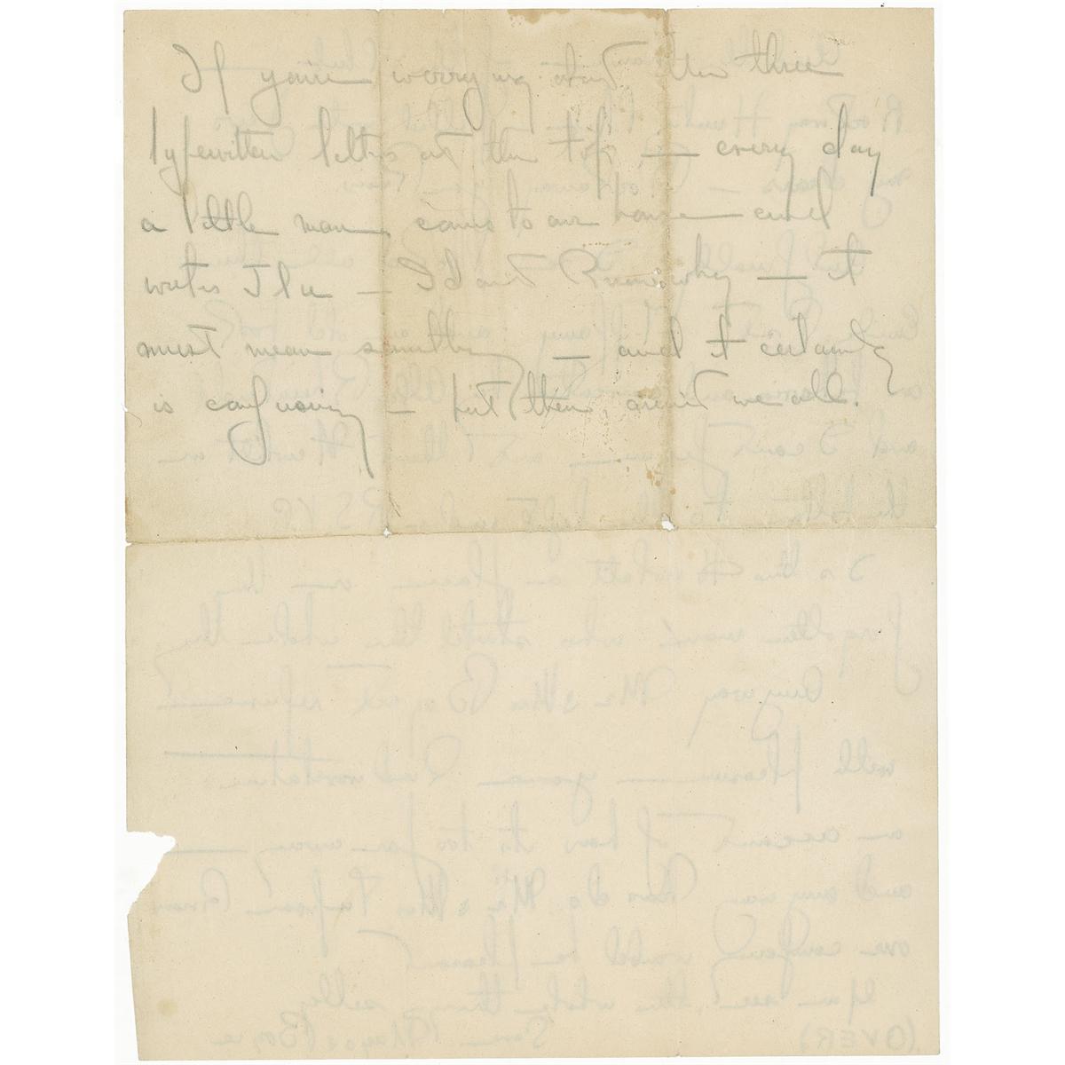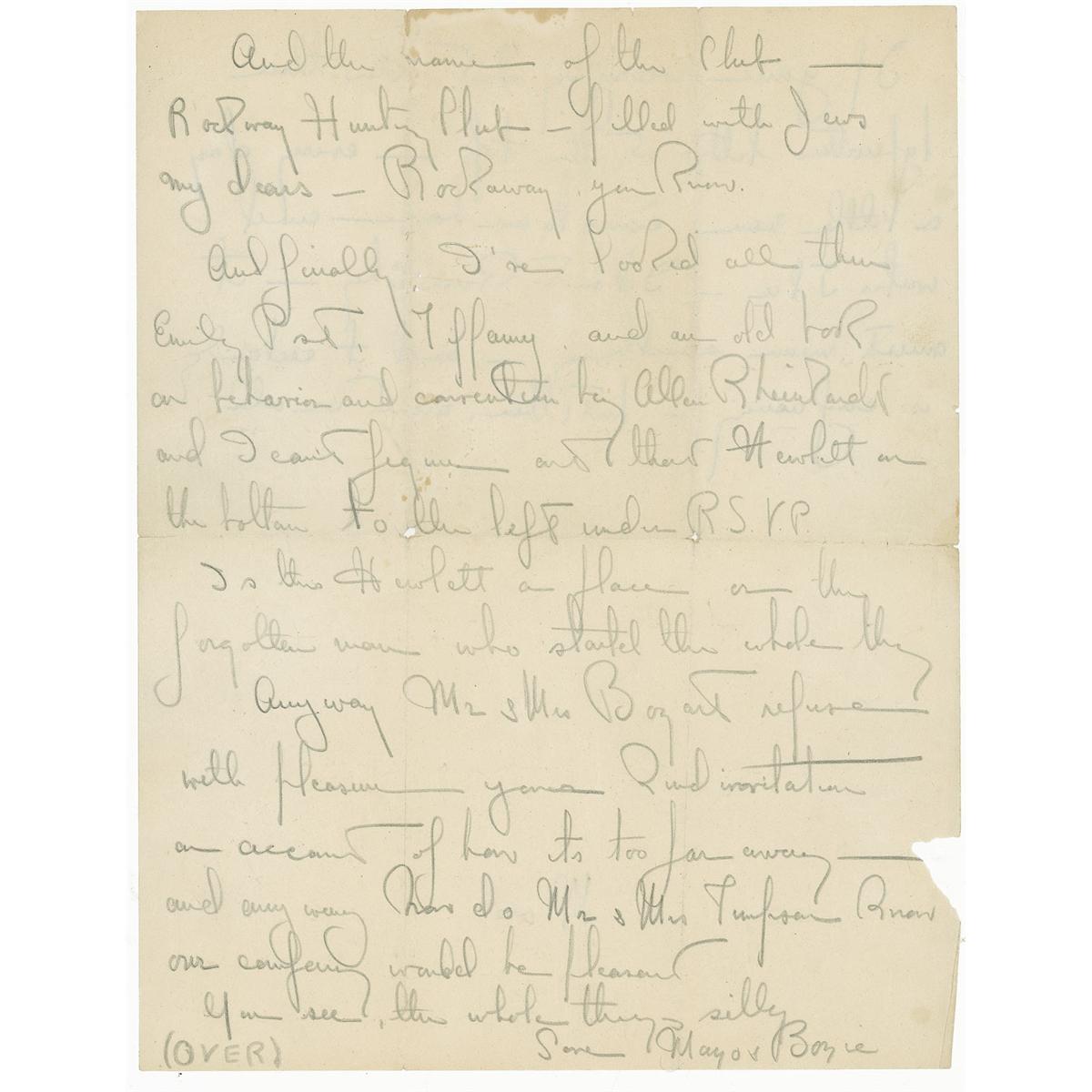 And the name of the Club—Rockaway Hunting Club—filled with Jews my dears—Rockaway you know…Anyway Mr. & Mrs. Bogart refuse with pleasure your kind invitation on account of how its too far away—and anyway how do Mr. & Mrs. Timpson know our company would be pleasant. You see, the whole thing’s silly.” In very good condition, with intersecting folds, one through a single letter of signature, scattered toning, two small holes at fold intersections and slight paper loss to second page, and scattered light creasing and wrinkling.