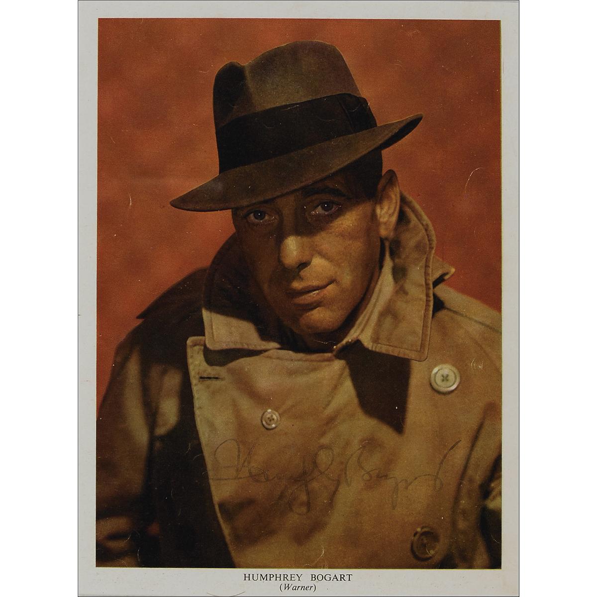 Terrific vintage color 6.25 x 8.5 paperstock photo of Bogart as he appeared in Casablanca, wearing his trademark trench coat and fedora, signed in fountain pen “Humphrey Bogart.” Matted and framed to an overall size of 11.5 x 13.75. Ink a shade or two light but fully legible, a hint of very subtle marginal rubbing, and a minor ding or two, otherwise fine, bright condition. Signed color images of Bogart, particularly in one of his signature roles, are quite elusive.