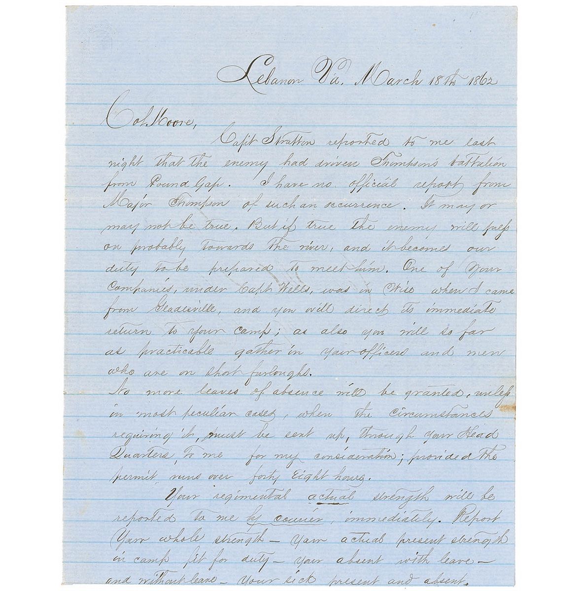 Your regimental actual strength will be reported to me by courier, immediately. Report your whole strength—your actual present strength in camp fit for duty—your absent with leave—and without leave—your sick present and absent.