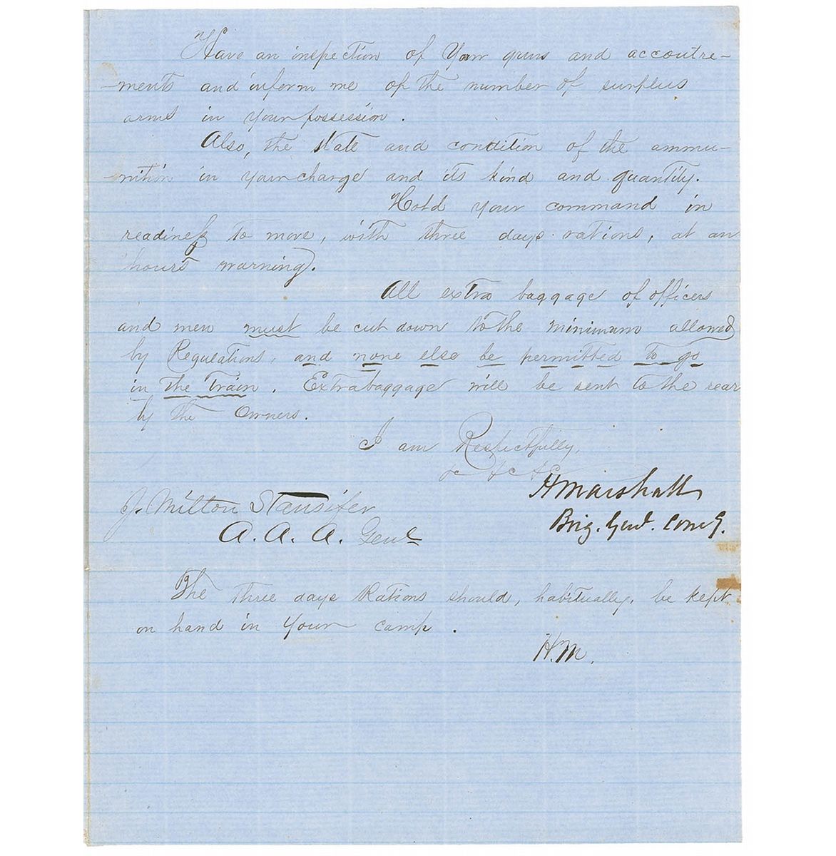 All extra baggage of officers and men must be cut down to the minimum allowed by Requisitions and none else be permitted to go in the train. Extra baggage will be sent to the rear by the owners.” In fine condition, with some scattered light toning, mainly along folds and edges.