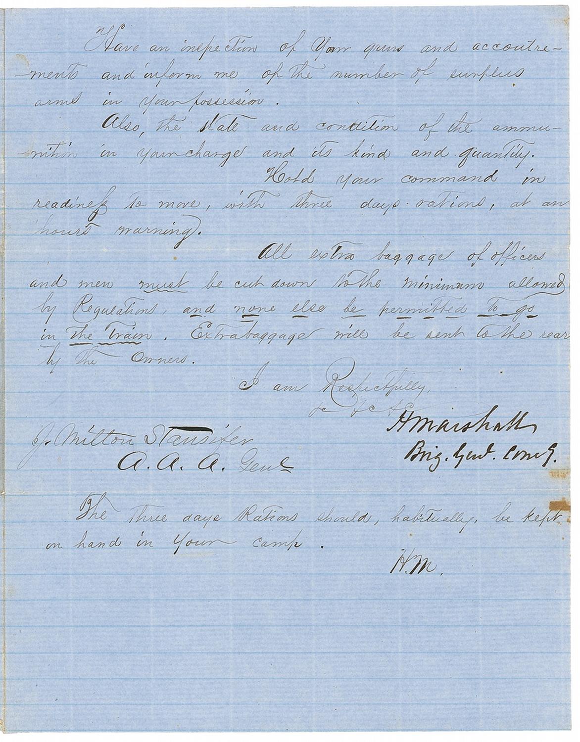 All extra baggage of officers and men must be cut down to the minimum allowed by Requisitions and none else be permitted to go in the train. Extra baggage will be sent to the rear by the owners.” In fine condition, with some scattered light toning, mainly along folds and edges.