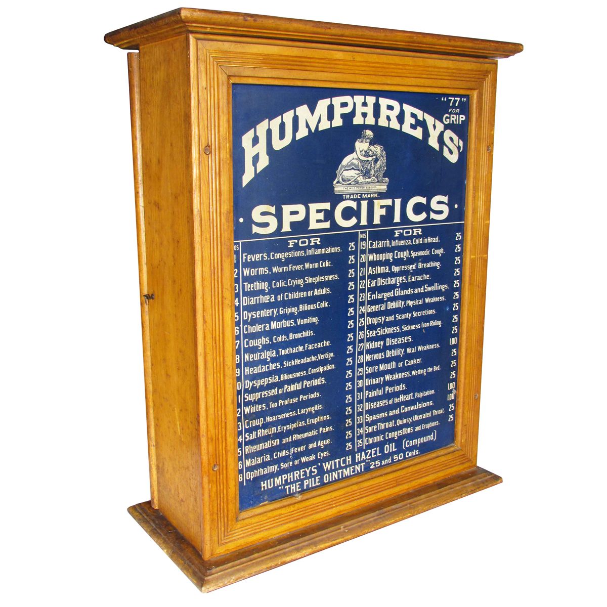Humphreys' Specifics Store Cabinet. Tin front with original numbered drawers and hardware. Stains on wood top and very minor rust on front, displays beautifully. 22 X 27 1/2 X 10 inches.