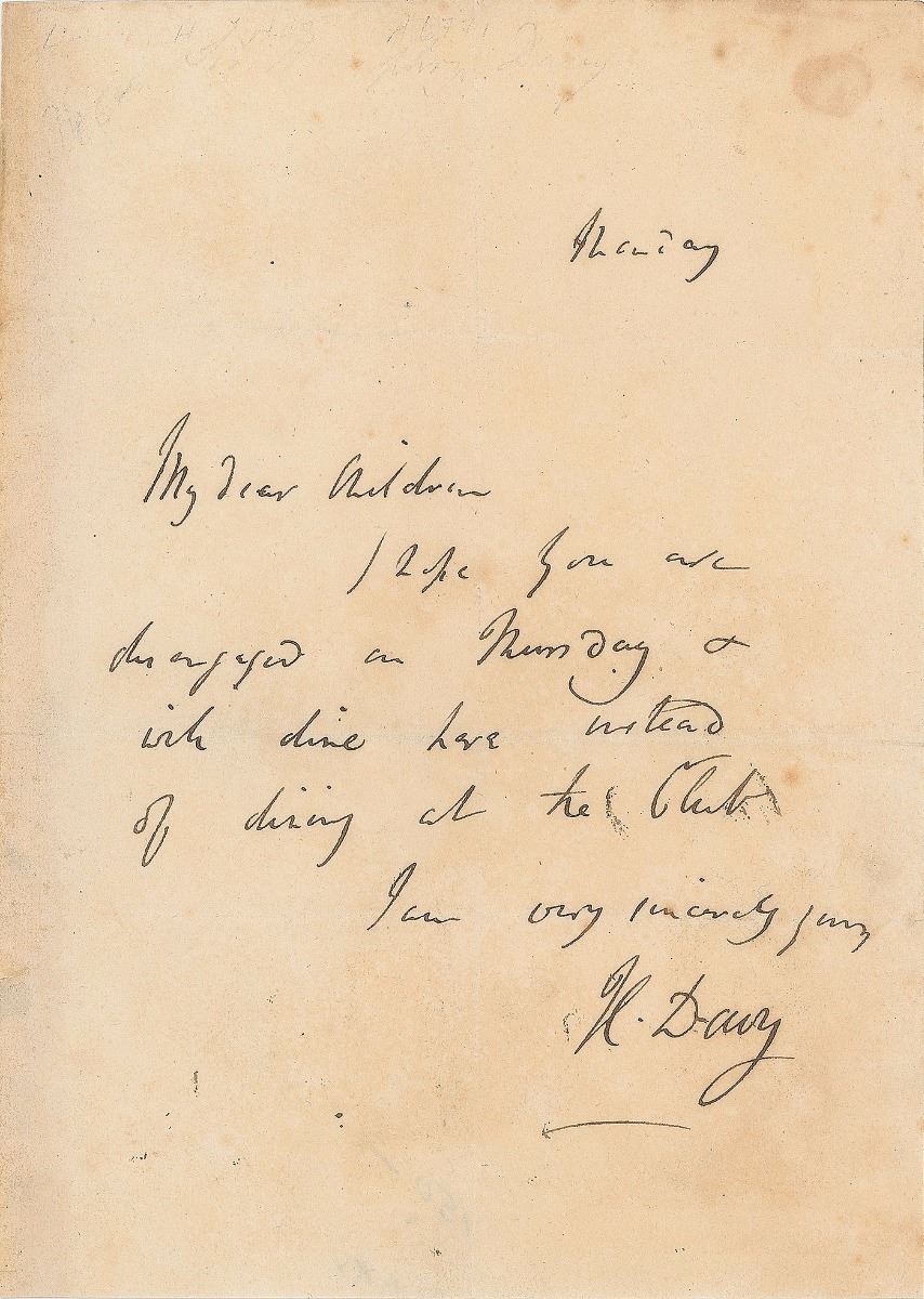 Chemist and inventor (1778–1829) best known for his discoveries of several alkali and alkaline earth metals, as well as contributions to the discoveries of the elemental nature of chlorine and iodine. ALS signed “H. Davy,” one page, 4.5 x 6.25, no date. In full: “I hope you are disengaged on Thursday & will dine here instead of dining at the Club.” In very good condition, with intersecting folds, light staining, and a mounting strip on reverse. Accompanied by an unsigned engraved portrait.