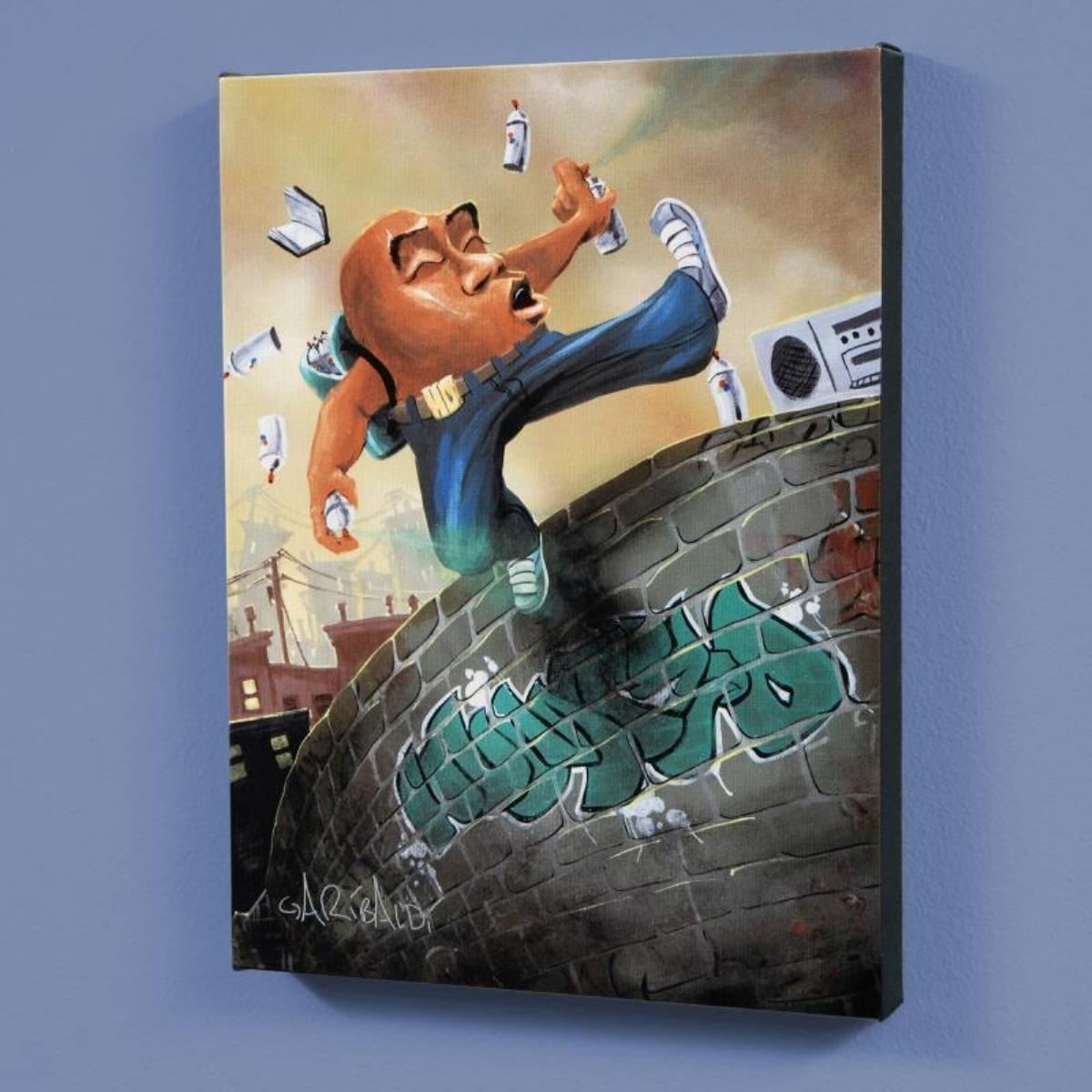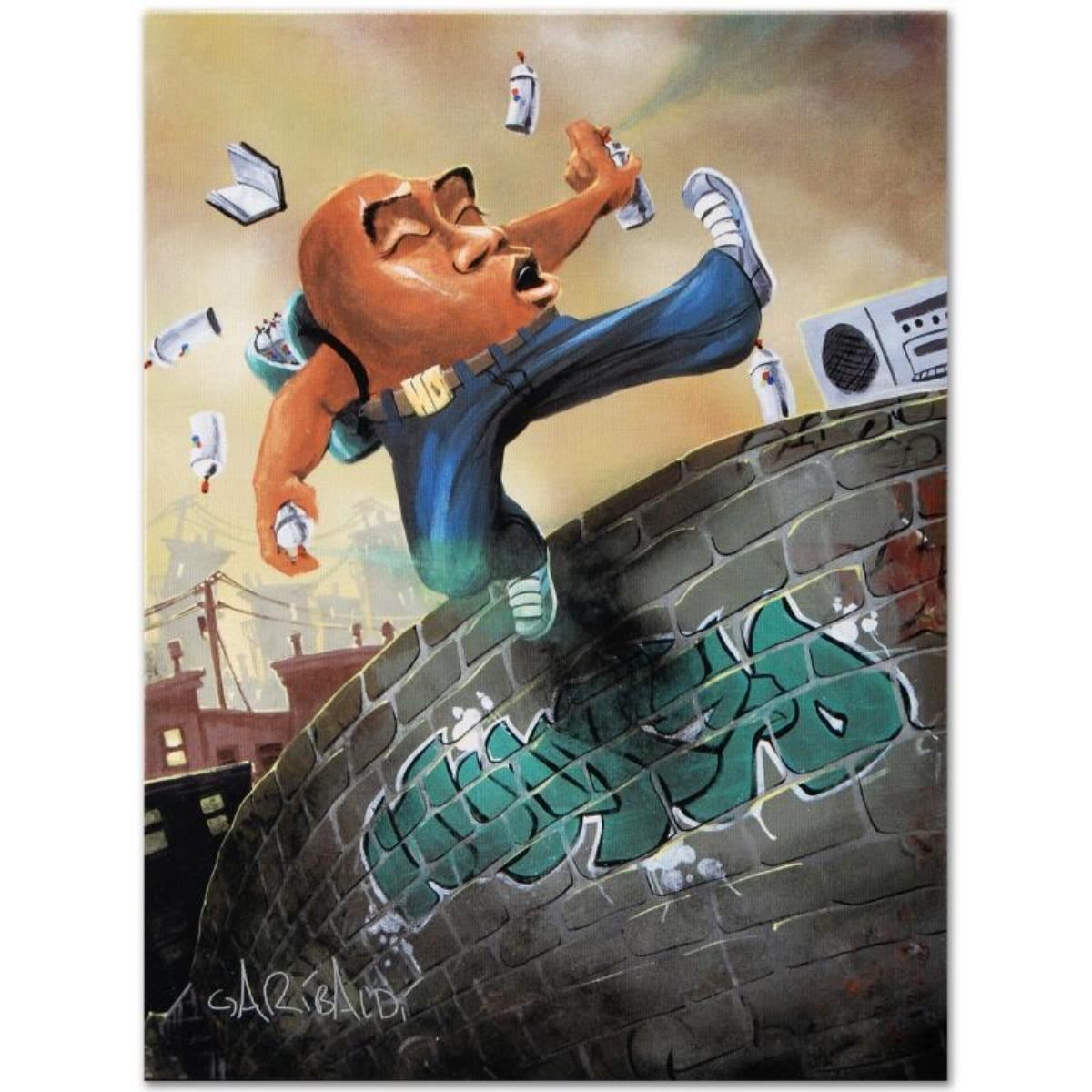 Combining his passions for music and art, David Garibaldi creates visual poetry. "Humpty Dumpty" is a limited edition giclee on stretched canvas, CC numbered from the miniature series and bearing the artist's authorized signature. This piece comes gallery wrapped. Includes Letter of Authenticity. Measures approx. 12" x 16" (image).