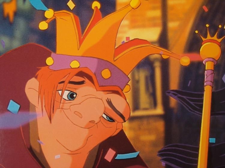 This is an original lobby card from the 1996 Disney animated feature "The Hunchback of Notre Dame." Quasimodo enjoys being crowned King of Fools, until he realizes people are making fun of him. The title and Disney logo are in the lower margin. Size: 14 x 11 inches Condition: Excellent