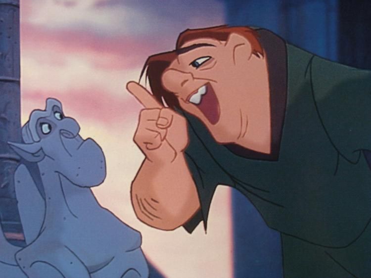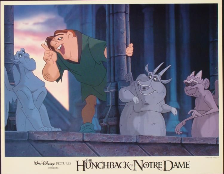 This is an original lobby card from the 1996 Disney animated feature "The Hunchback of Notre Dame." Quasimodo is here talking with his three gargoyle friends. The title and Disney logo are in the lower margin. Size: 14 x 11 inches Condition: Excellent