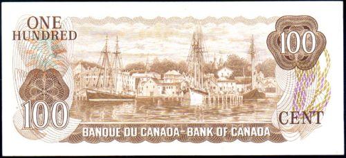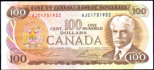 Bank of Canada One Hundred Dollars 1975, Lawson Bouey BC-52a-i, Serial Number AJC1751932, AU-Uncirculated