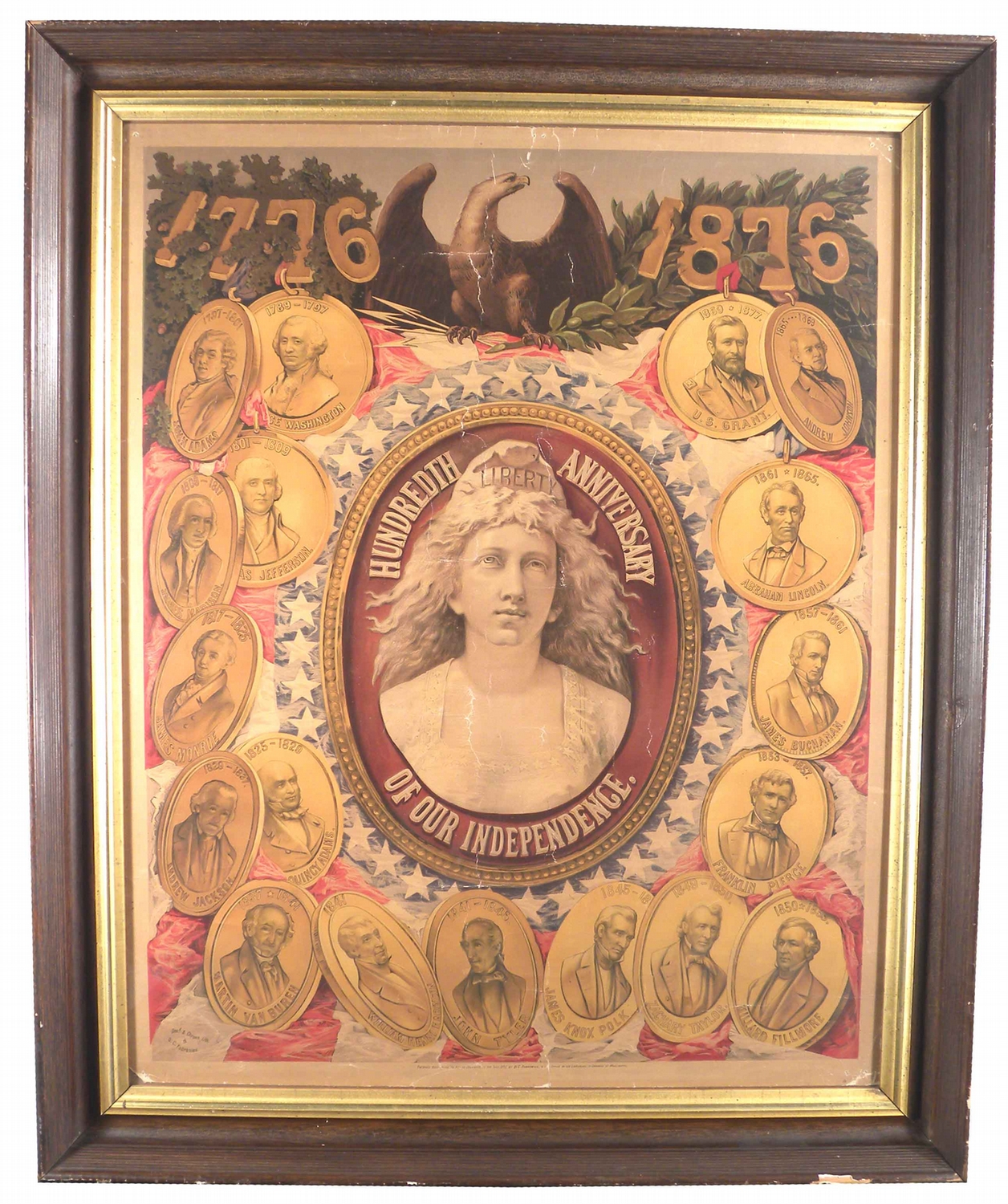 Hundredth Anniversary of Our Independence Poster. Centennial poster depicting 100 years of Presidents and Lady Liberty in the center. Framed under glass. A few tears and nail holes in corners otherwise good condition. 24 X 30 inches image only.