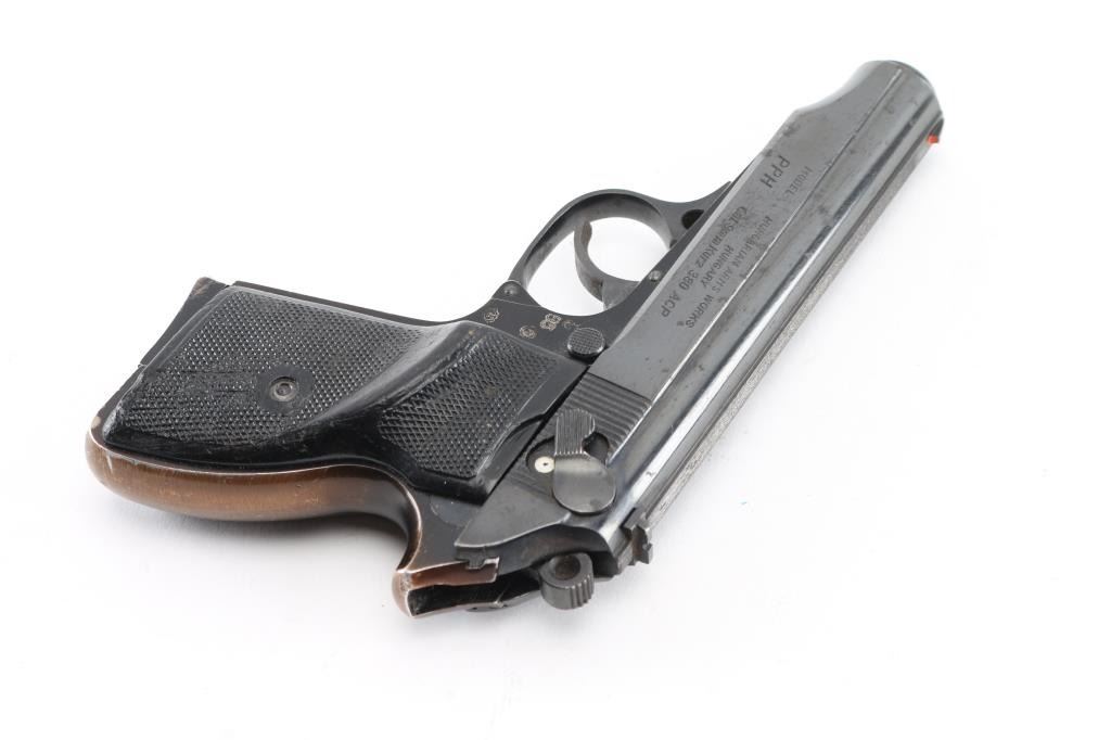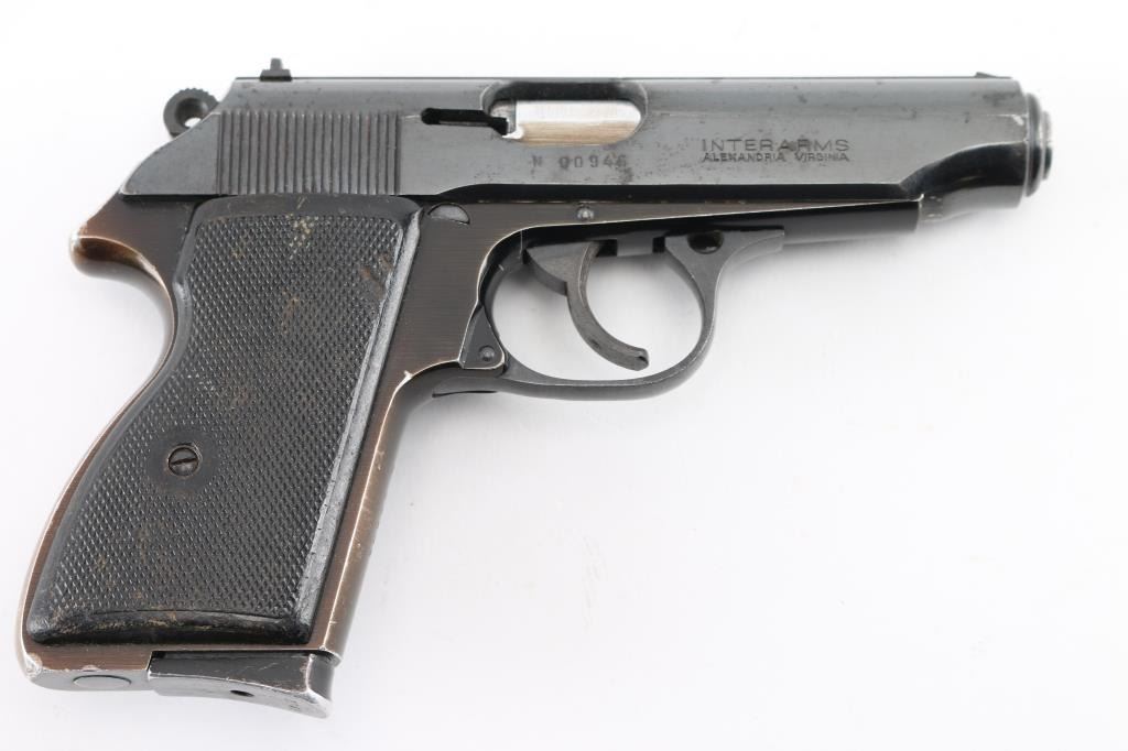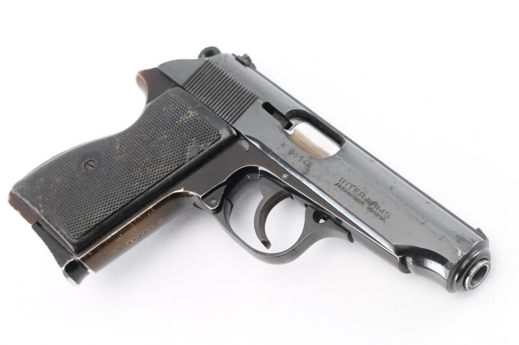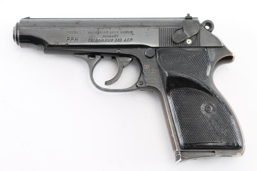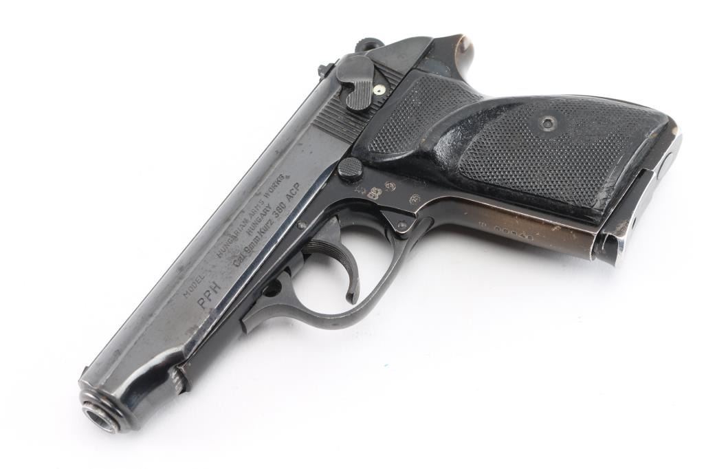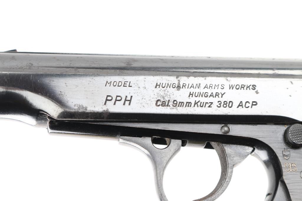 Hungarian semi-automatic pistol imported by Interarms, Alexandria VA. Features blued/black finish, checkered black composite grips (thumb rest on left grip for right handed shooter), 3.8" barrel, fixed sights, double/single action trigger, slide mounted decocker/safety(loose), push button magazine release, alloy frame. Bore is Excellent/bright. Retains 85% finish with signs of handling and use. Missing extractor. Grip straps have faded to a copper color. Grips are good with wear. Includes one 9 round magazine. Condition is NRA Fair. Modern Firearm.