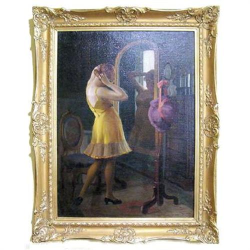This is a large, framed oil painting on canvas by the hand of Emil Pap (1884-?), the noted Hungarian painter. Frame measures 38" by 48" by 3" and exposed canvas measures 28.5" by 38.5". Professionally mounted in an ornate, gilt wood frame with paper backing. Depicted is a lovely woman in yellow slip, standing before her dressing mirror that's lit by an open window at the opposite end of the room. Pap has employed a lovely use of light and shadow here. Signed "Pap Emil" by the artist in the lower left corner. Precise age is unknown, but it must date from no later than the early/mid 20th century.
