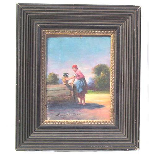 This lovely oil painting on board is by Imre PERLMUTTER (1892-?). Board measures 4.5" by 6" and frame measures 8" by 10". Depicted is a peasant woman placing reaching toward a large ceramic jug that's resting upon a wooden fence or structure of some kind. This is an excellent small painting on wooden board, and one of three paintings by Perlmutter that we currently have for sale. The rear carries the stamp of Magyar Nemzeti Galeria, the Hungarian National Gallery, indicating the piece was authenticated and approved for export according to Hungarian law.