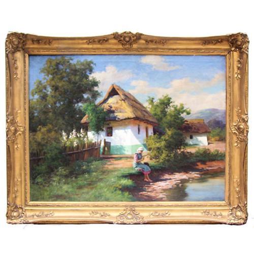 This is an exceptional, large oil on canvas by the Hungarian artist, Tibor Szontagh (1873-1930). Artist's signature is covered by the frame. Canvas measures 30" by 40" (75 cm by 100 cm) and frame measures 36" by 46" (91 cm by 117 cm). Depicted is a peasant girl pealing vegetables on the banks of a river, beside her modest country home. This work illustrates a lovely use of light and shadow and depth of field. This work likely dates from the early 20th century and resides in a period giltwood frame. There is considerable wear along the edge of the frame along the top and one side.