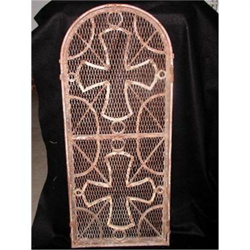 </font></strong>Stunning C.1835-50 hand forged metal church window and screen from Hungary with two crosses and wonderful scroll work. The metal screen with fine metal mesh is hinged to the window with latches on the opposite side. A little crusty with age and aged white paint showing. Wonderful wall hanging with a mirror placed inside the frame behind or used in the garden,interior or installed as intended,a window. Measures 46H X 18.5W S 1.25D. </font>
