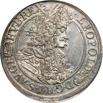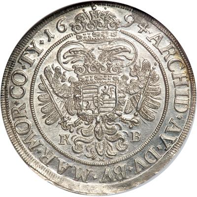 Hungary. ½ Taler, 1694-KB (Kremnitz). KM-220. Leopold I, 1657-1705. Laureate bust right. Reverse: Crowned double eagle. Brilliant and fully lustrous. NGC graded MS-64.
