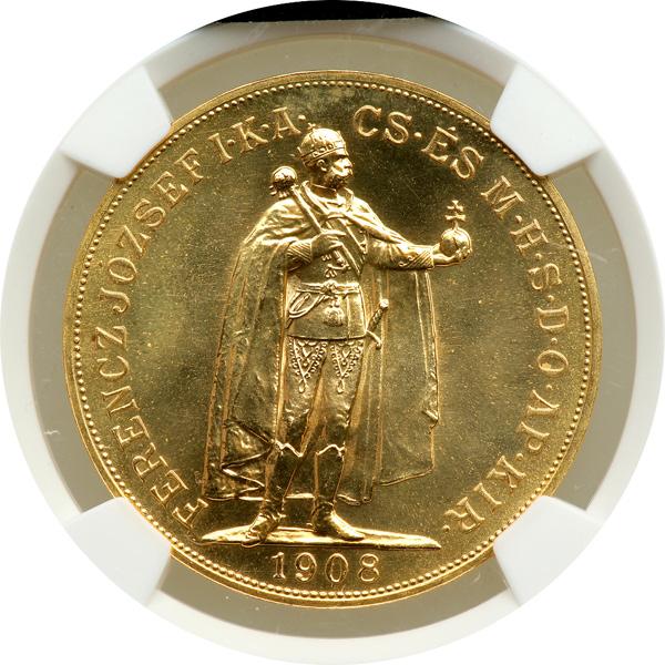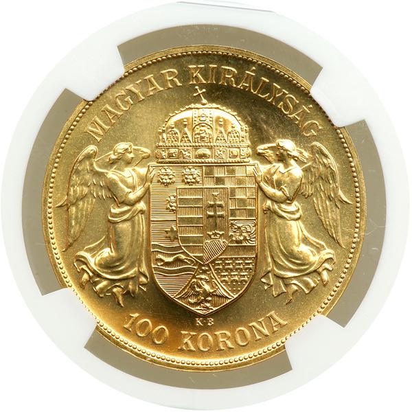 Hungary. 100 Korona, 1908-KB. Fr-249R; KM-491. Weight 0.9802 ounce. Franz Joseph. Emperor standing. Reverse: Crowned arms. Restrike. NGC graded MS-67.
