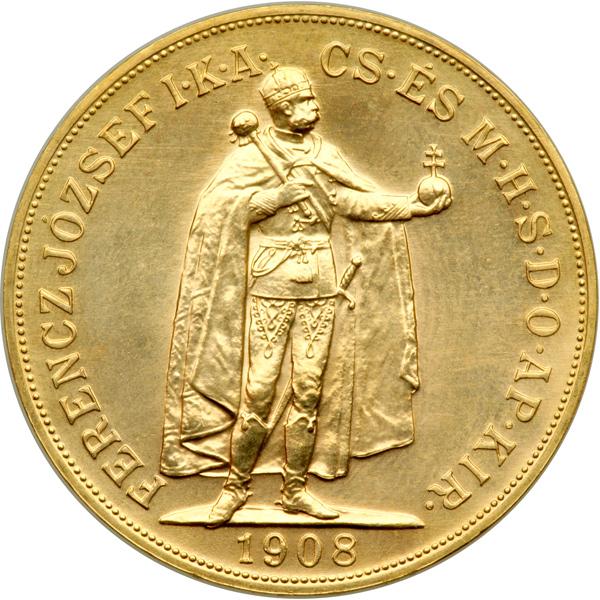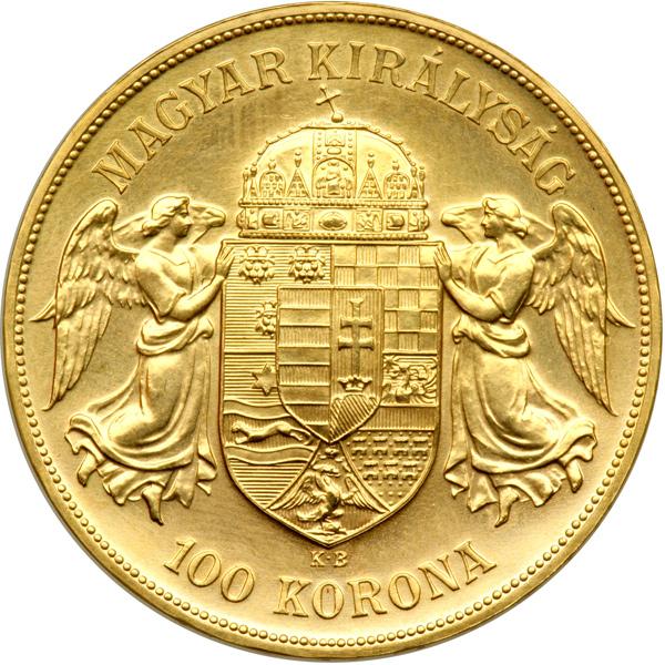 Hungary. 100 Korona, 1908-KB. Fr-249R; KM-491. Restrike. Weight 0.9802 ounce. Franz Joseph I. Emperor standing. Reverse: Crowned and supported arms. Brilliant Uncirculated.