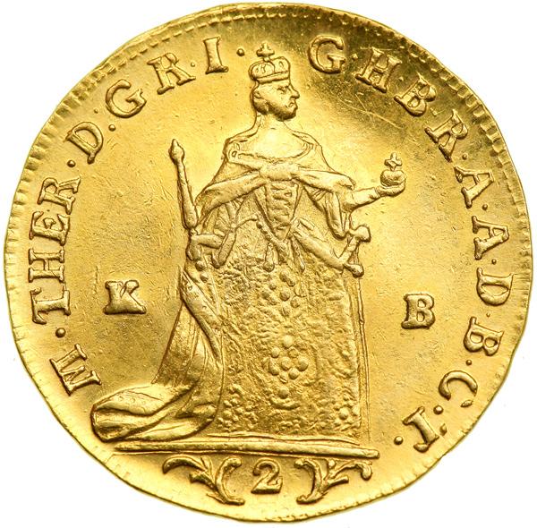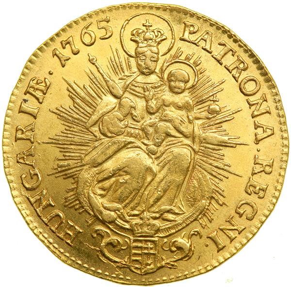 Hungary. 2 Ducats, 1765-KB. Fr-179; KM-379. 6.9 grams. Maria Theresia, 1740-1780. Ruler standing. Reverse: Madonna seated with child. Lustrous. About Uncirculated.