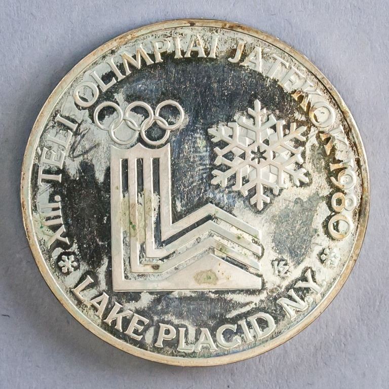 Hungarian coin. Commemorative XII Winter Olympic's coin, featuring Lake Placid. Obverse: Ice-dancing pair. Lettering: MAGYAR NÉPKÖZTÁRSASÁG / 200 FORINT / BP. 1980 / KZ. Reverse: The emblem of the 13th Winter Olympic Games. Lettering: XIII. TÉLI OLIMPIAI JÁTÉKOK 1980 / LAKE PLACID N.Y. / KZ. Diameter: 3.5 cm, 32 grams.
