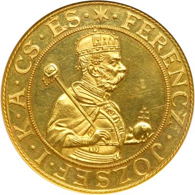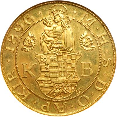 Hungary. 9 Ducat, 1896-KB. Fr-257; KM-Bruce X#8.1a. Reported mintage of only 100 pieces. Crowned bust right holding sword and orb. Reverse: Madonna and arms. On the 1000th year of the Hungarian Kingdom. Rare. NGC graded Proof 61.
