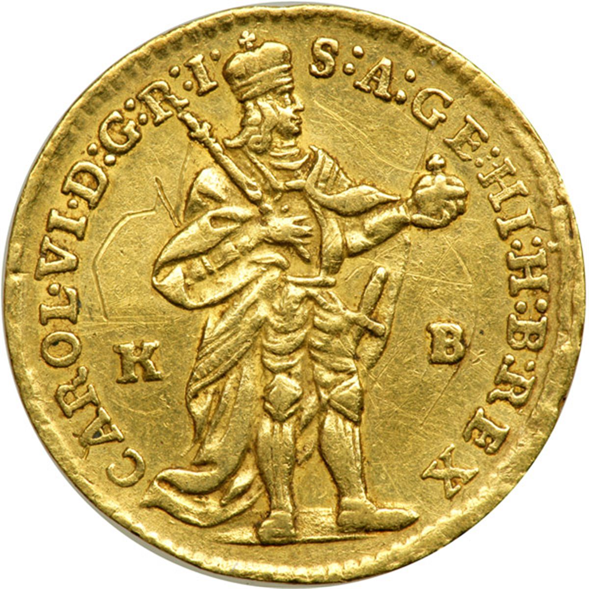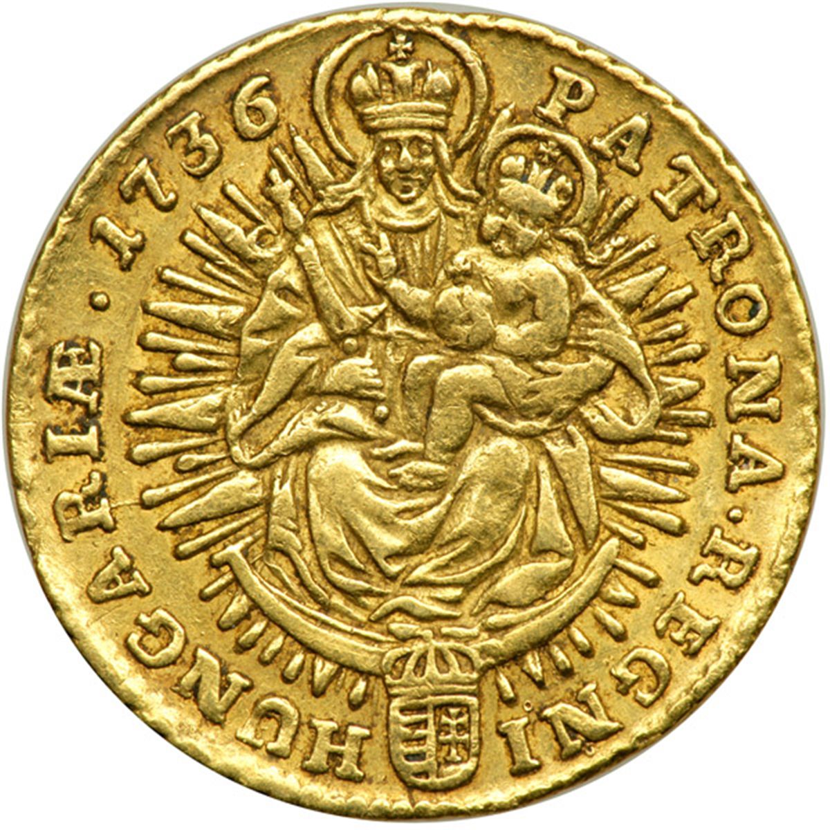 Hungary. Ducat, 1736-KB. Fr-171; KM-306.2. Karl VI, 1711, 1740. Ruler standing. Reverse: Madonna and child in flames. Obverse scratches. Very Fine.