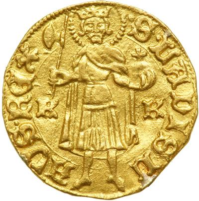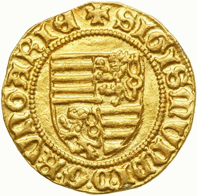 Hungary. Goldgulden, ND. Fr-10. Mint mark, K K. Kremnitz mint. Sigismund, 1387-1437. Quartered arms with lion. Obverse legend. +SIGISMVRDI. D. G. R. VRGARIE. Reverse: St. Ladislas standing holding battle ax in right hand and orb in left. Reverse legend: S. LADISL - AVS. REX. Solder mark on edge. Extremely Fine.