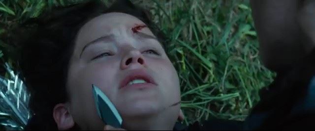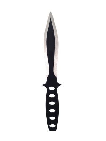 From The Hunger Games (2012), this is Clove's (Isabelle Fuhrman) special effects throwing knife. It was used in scene 217 (the lizard scene) and is black and silver with holes on the grip (resin). (approx. 8" x1")