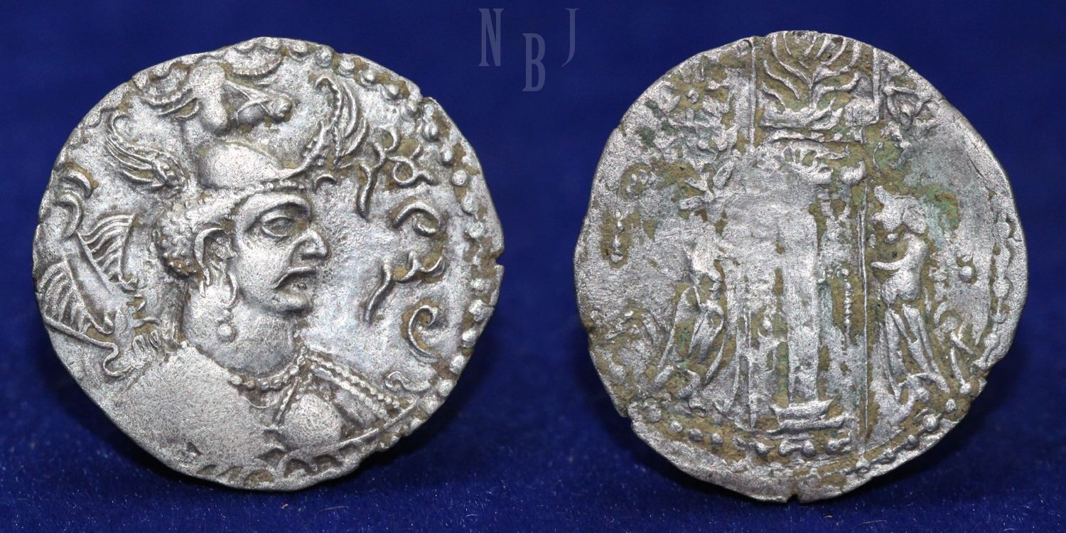 Hunnic Tribes: AR Drachm. Kabul mint. Nezak Huns. Anonymous Group II circa AD 515-650. Bust right, wearing winged bull's head crown. Fire altar, attendants flanking; wheel symbols flanking flames. (3.10gm, 28mm) Good Very Fine.