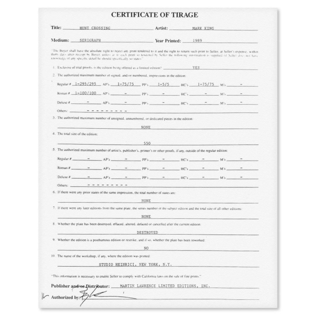 "Hunt Crossing" is a limited edition serigraph on paper by Mark King (1931-2014). Hand signed and numbered, this piece comes with a letter of authenticity and measures approximately 29" x 37" (image).