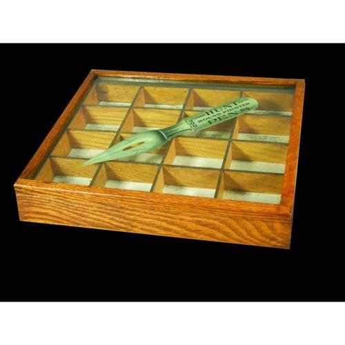 Hunt Pins Oak Store Display Case. Original labels in compartments. Excellent original condition. 12 1/2 x 5 1/4 x 10 1/4.