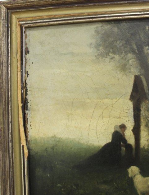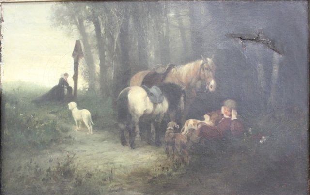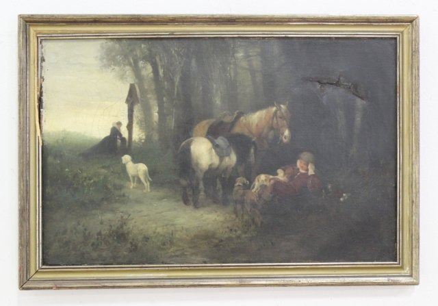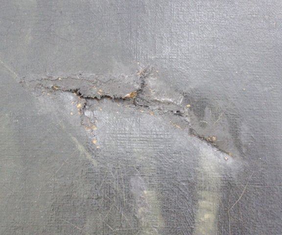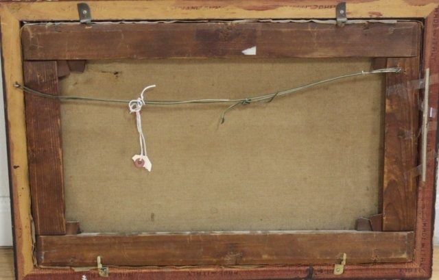 Oil on canvas. Artist signed illegibly lower right. Approx. 13 7/8" H x 21 1/4" W sight, 16 1/4" H x 24" W framed. Damage upper right. Damages to frame.