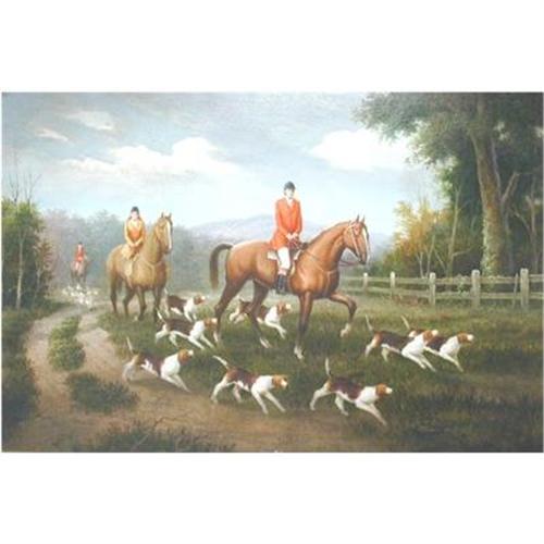 The Hunt is an original oil painting of riders, horses and dogs in the countryside. It is signed in the lower right H(erman?) Hill. Circa 1950-1980. This beautiful painting is 24 x 36 inches. The wood frame has a gold finish and is 32 x 44 inches. It is in very good condition. Do not hesitate to contact us concerning any questions. Crating, shipping & insurance in the 48 states is $185.00. Contact us about shipping rates to other destinations.