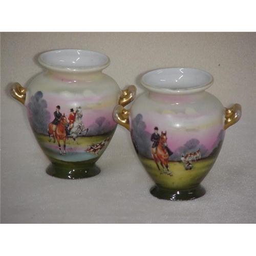 A pair of vases, 3 3/4" tall, 3" in diameter, each with a transfer design of a hunt scene, with hand painted background. Made in Tettau, Bavaria, Germany. A beautiful pair of vases for the collector of hunt items. Condition is very good, there is some slight wear to the gold on the handles and around the tops, otherwise there are no chips or cracks.