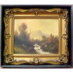 Hunt, landscape with mountain stream, oil on canvas, signed Hunt (L.L.), framed, image measures 16" x 20" (some crazing on upper left and along bottom)
