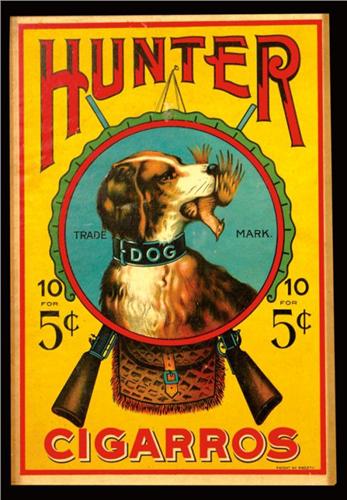 Hunter Cigarros Paper Sign. Fabulous color and graphics. Near mint condition. Framed under glass. 7 1/4 X 10 1/2 inches image only.