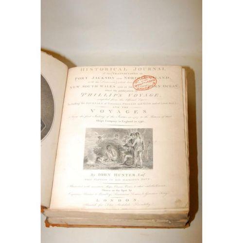Hunter, John. Historical Journal of the Transactions at Port Jackson and Norfolk Island..... London: Printed for John Stockdale, 1793. First Edition. 4to - over 9¾" - 12" tall. Hard Cover. Ex-Library. Good Condition. Title continues: With the Discoveries Which Have Been Made in New South Wales and in the Southern Ocean Since the Publication of Phillip's Voyage, Compiled from the Official Papers; Including the Journals of Governors Phillip and King and of Lieut. Ball; and the Voyages from the First Sailing of the Sirius in 1787, to the Return of that Ship's Company to England in 1792. Complete with 17 maps and plates (some folding), and numerous Tables. Frontis, title page with vignette, List of Subscribers 3 leaves, List of Plates 1 leaf, Contents 4 leaves, 583pp [1] publishers advertising 2 leaves. Bound in leather with gilt borders, marbled endpapers, marbled page edges all around, letterpress on laid paper. Worn covers detached, backstrip detached & laid in, inner joint starting, one of the folding maps has closed tears, lower edge of title page slightly cropped, closed tears on 3 leaves, foxing on prelims.