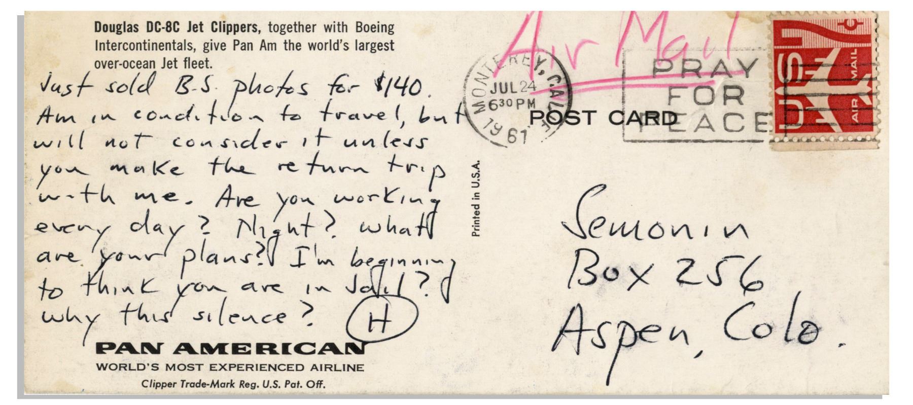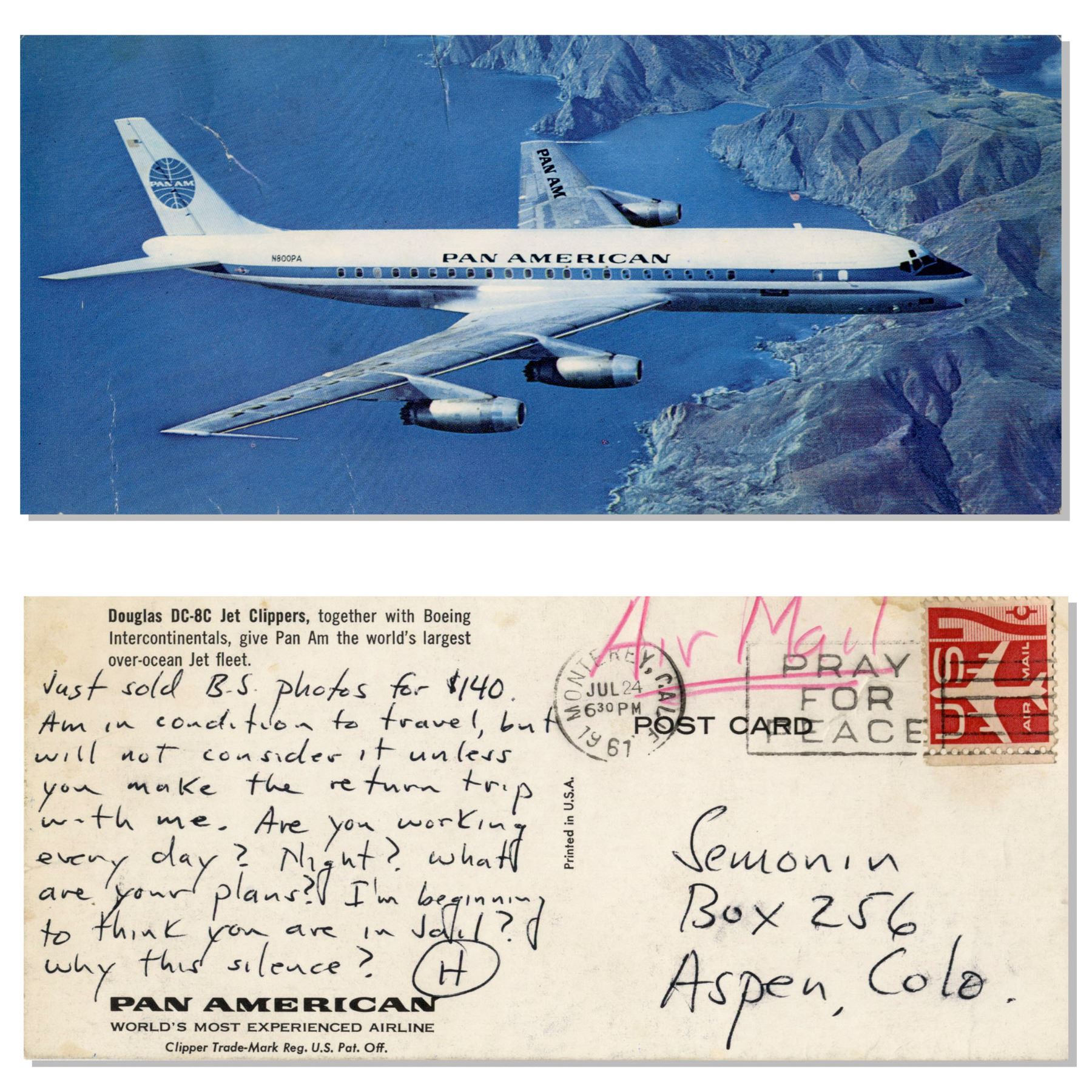 Hunter S. Thompson autograph letter signed, written on the verso of a postcard showing a Pan Am plane in flight. Appropriately, Thompson writes that he's ''in condition to travel'', writing to his friend Paul Semonin. Card is postmarked 24 July 1961 from Monterrey, California, reading in full, ''Just sold B.S. [Big Sur] photos for $140. Am in condition to travel, but will not consider it unless you make the return trip with me. Are you working every day? Night? What are your plans? I'm beginning to think you are in Jail? Why the silence? H''. Postcard measures 6.75'' x 3.25''. Some creasing, very good condition.