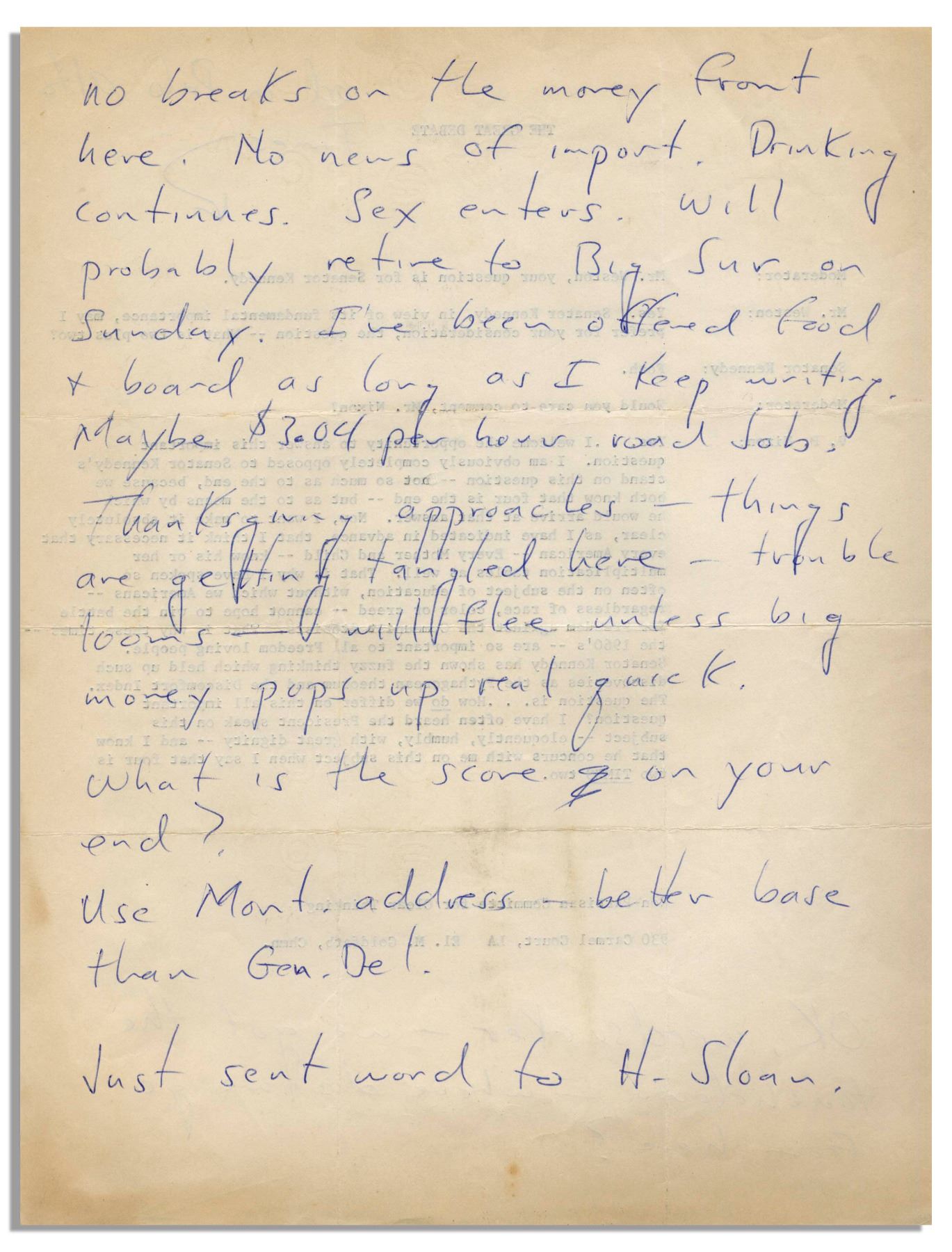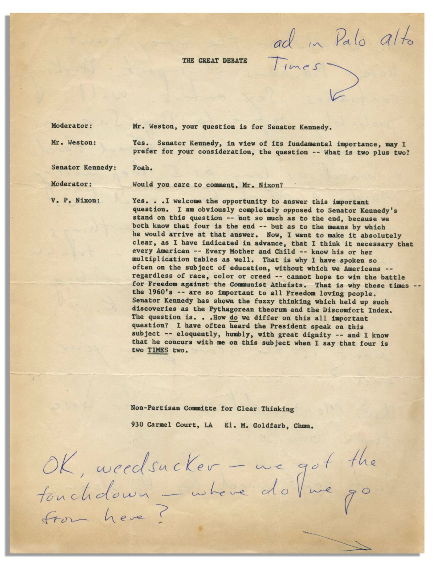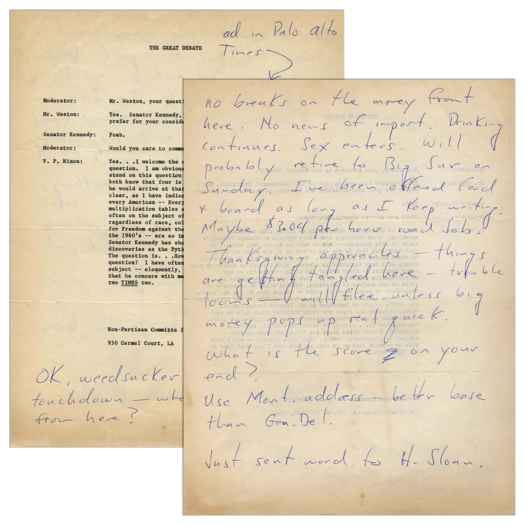 Hunter S. Thompson autograph letter, written shortly before Thanksgiving 1960 and composed on the opposite side of a typed satire entitled ''THE GREAT DEBATE'', with a made-up exchange between Kennedy and Nixon. Underneath, Thompson writes of Kennedy's Presidential victory, ''Ok weedsucker - we go the touchdown - where do we go from here?'' He then draws an arrow to the other side of the page where he writes, ''no breaks on the money front here. No news of import. Drinking continues. Sex enters. Will probably retire to Big Sur on Sunday. I've been offered food & board as long as I keep writing. Maybe $3.04 per hour road Job. Thanksgiving approaches - things are getting tangled here - trouble looms - will flee unless big money pops up real quick. What is the score on your end?...'' Paper measures 8.5'' x 11''. Folds and light toning, overall very good plus condition with unique content.