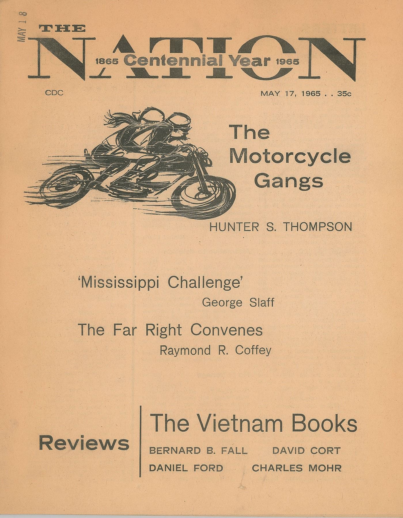 Rare original issue of The Nation from May 17, 1965, Vol. 200, No. 20, 30 pages, 8.5 x 10.75, with front cover showing motorcycle artwork next to bold text promoting "The Motorcycle Gangs," an article written by gonzo journalist Hunter S. Thompson. The five-page article, "The Motorcycle Gangs: Losers and Outsiders," begins on page 522 and reads, in part: "Last Labor Day weekend newspapers all over California gave front-page reports of a heinous gang rape in the moonlit sand dunes near the town of Seaside on the Monterey Peninsula. Two girls, aged 14 and 15, were allegedly taken from their dates by a gang of filthy, frenzied, boozed-up motorcycle hoodlums called 'Hell's Angels,' and dragged off to be 'repeatedly assaulted.'" In fine condition, with expected light age toning.